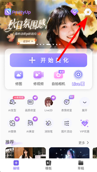 1、打开PrettyUp APP,点击右上角设置图标,进入设置页面。