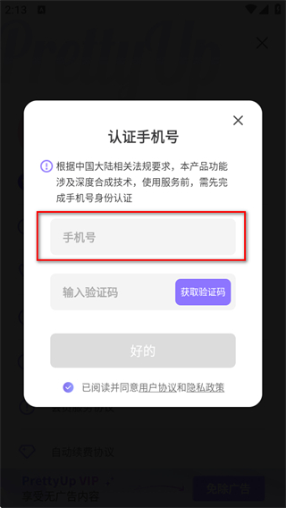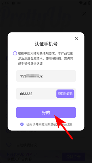 4、信息填写完成后点击好的,即可完成PrettyUp的手机号绑定操作。