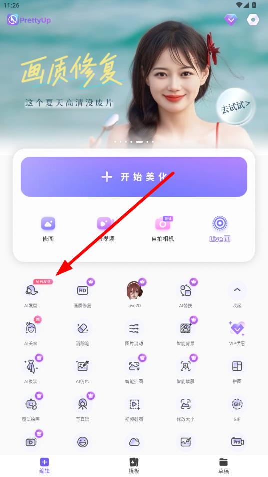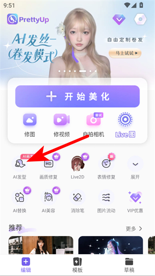 1、打开PrettyUp APP,点击AI发型,进入发型选择页面。