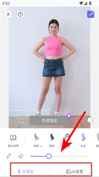3、在编辑页面可选择AI发丝或AI发型,并调整相关参数进行头发美化。