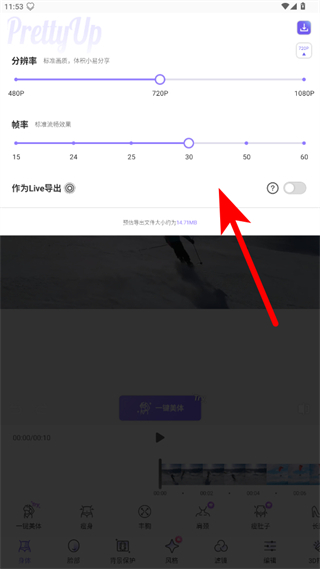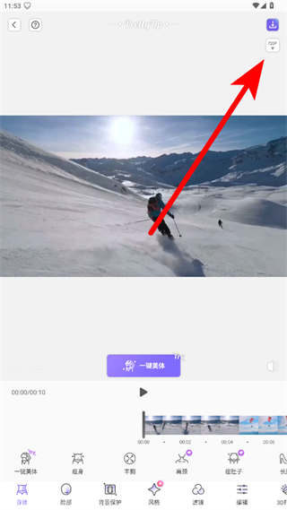 3、进入视频编辑界面后,点击右上角带有分辨率数值如720P的按钮。