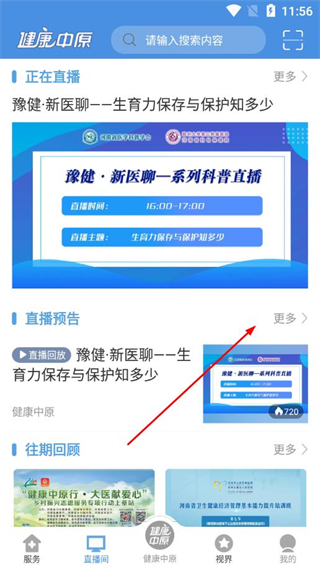 1、打开健康中原app首页,点击底部直播间,进入直播相关页面。