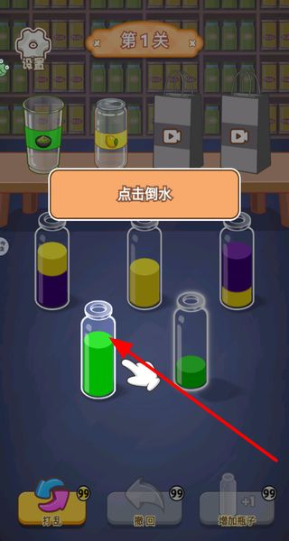 1、关卡中点击装有液体的瓶子,将其液体倒入对应空瓶,按液体颜色归类,完成水杯的排序操作。