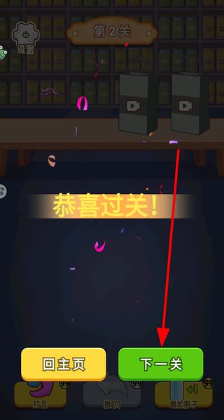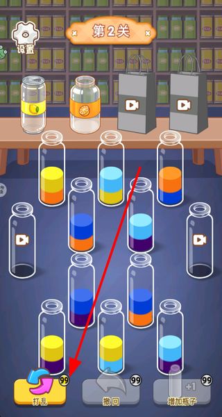 2、若排序思路混乱,可点击打乱按钮重置瓶子布局,重新规划液体的归类顺序,推进关卡进程。