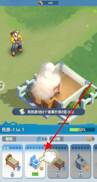 3、在民居界面建造床和马桶等家具,提升角色的睡眠和心情属性,推进民居的升级进度。