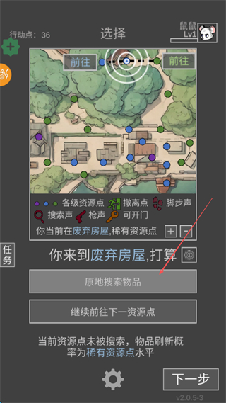 2、在地图界面选择原地搜索物品,在废弃房屋中获取资源道具。
