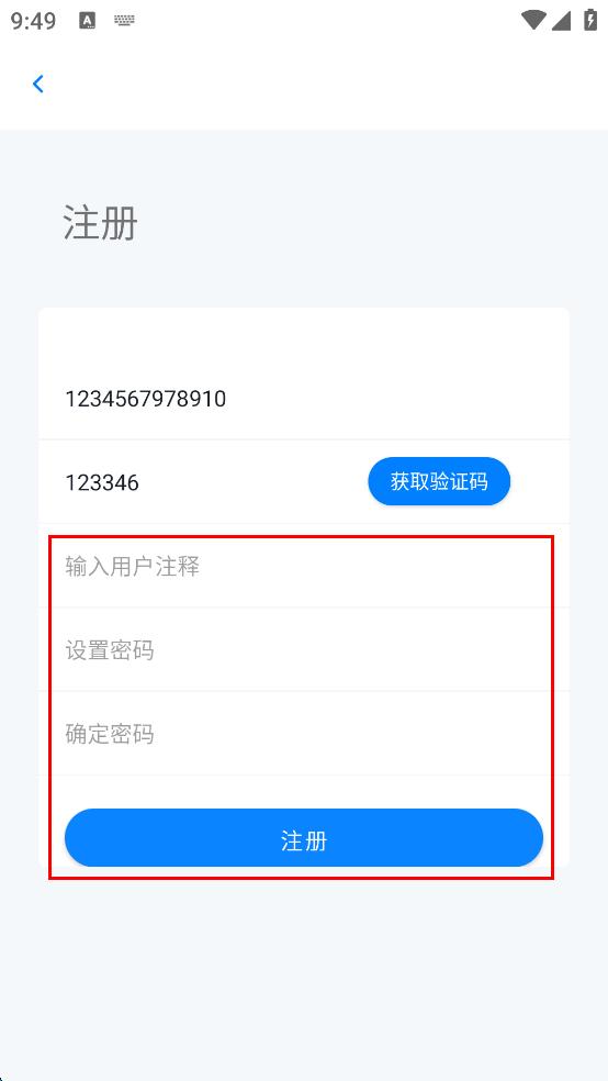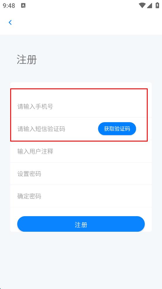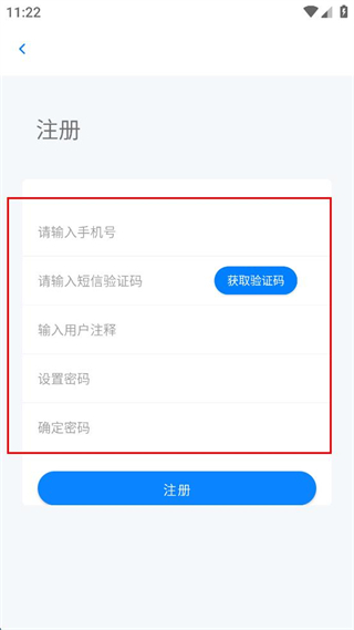 3、在注册界面依次输入手机号、短信验证码、用户注释、设置密码、确定密码。