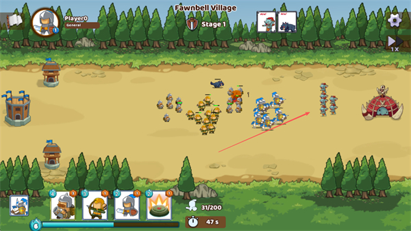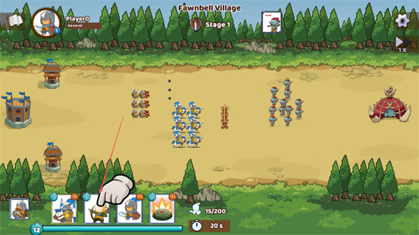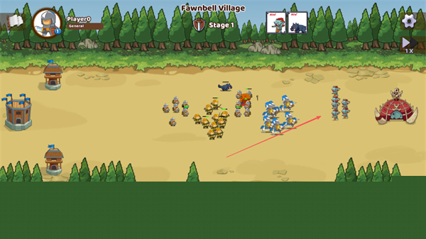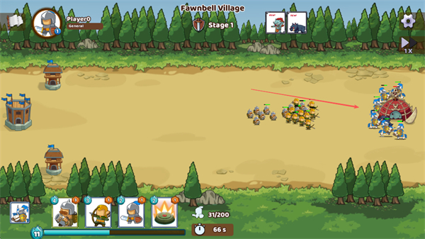 1、在FawnbellVillage的Stage1中,点击底部兵种图标召唤士兵,部署至战场。
