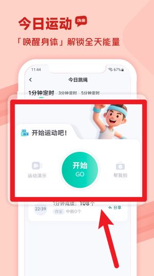 1、打开APP,点击“开始运动”按钮可快速进入锻炼模式,唤醒身体、激活全身能量,适合每日晨练使用。