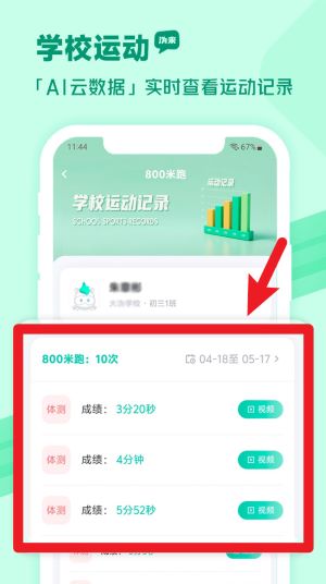 2、在“学校运动”页面中,系统会根据AI云数据自动记录运动成绩,可随时查看不同日期的训练表现。