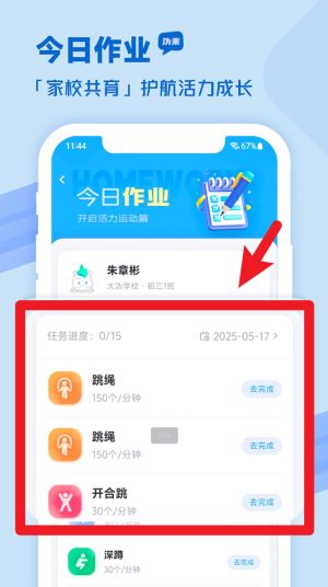 3、“今日作业”功能将跳绳、开合跳等任务进度清晰展示,便于用户每日打卡与家校协同完成训练目标。