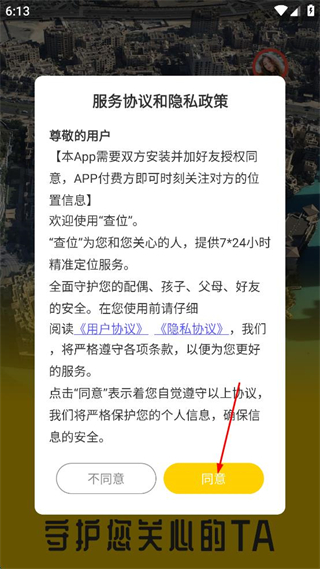 1、打开查位APP,查看弹出的服务协议和隐私政策内容,确认后点击同意按钮进入主界面。