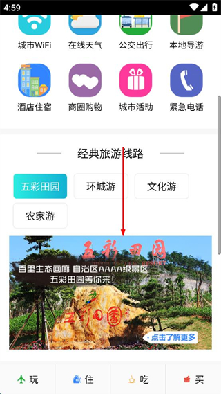 1、打开旅游服务软件,进入主页面后,找到经典旅游线路板块,选择五彩田园选项。