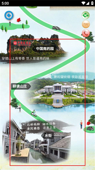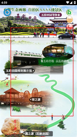 4、继续向下滑动页面,查看中国南药园耕读山庄水街等剩余的五彩田园景点信息。
