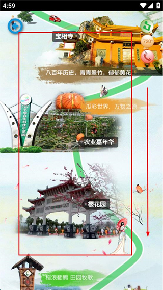 3、在详情页面中向下滑动,查看宝相寺农业嘉年华樱花园等更多五彩田园相关景点。