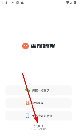 1、打开番茄标签app,在登录页面,点击下方的注册选项。