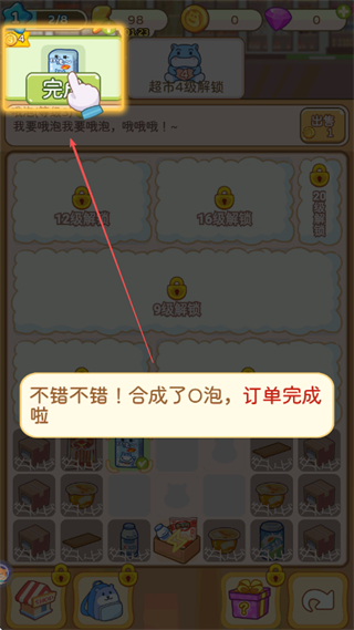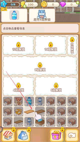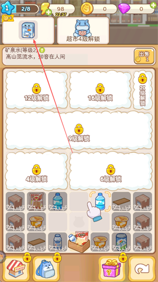 3、合成出矿泉水等级2,解锁更高等级物品,继续合成。