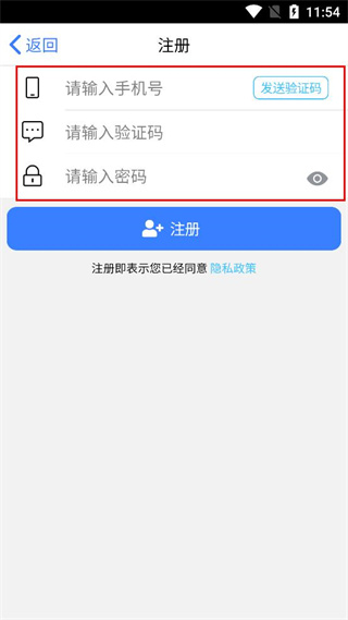 2、进入注册页面后,在手机号输入框填写个人号码,点击发送验证码按钮获取验证码。