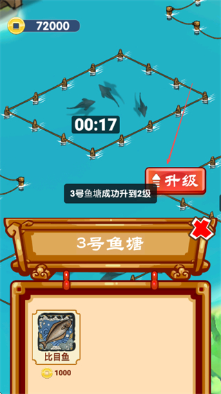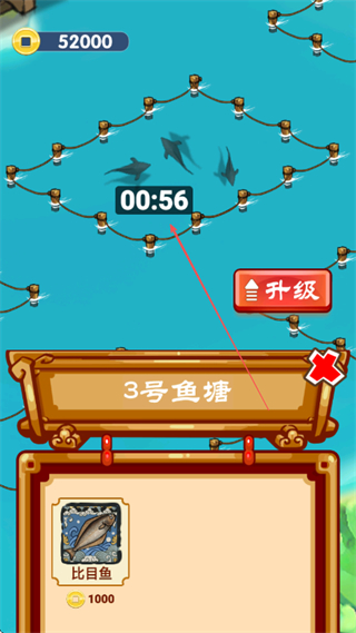 1、在1号鱼塘消耗1000货币投放比目鱼,点击升级可提升鱼塘等级。