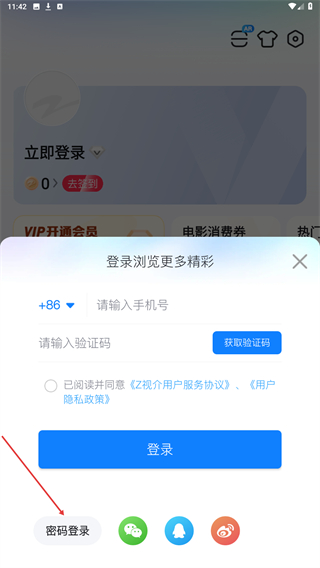 3、在登录界面的底部区域,点击密码登录选项,切换至账号密码登录的输入界面。