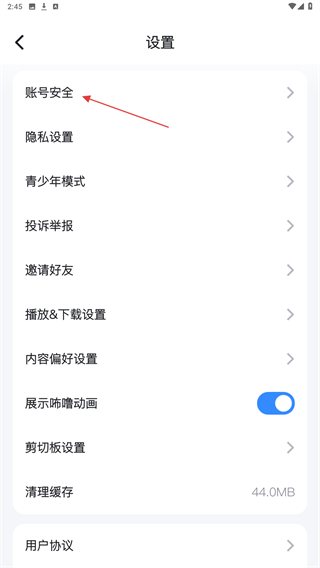 3、在设置的界面内,点击账号安全的按钮。