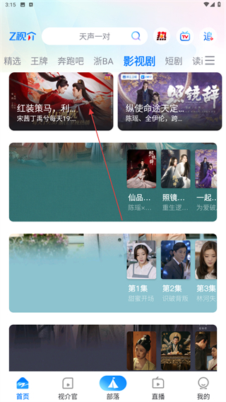 1、启动中国蓝tv的APP,在首页上方点击影视剧的标签。