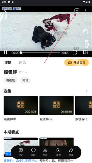 3、进入播放的页面内,点击画面上方TV的图标即可。