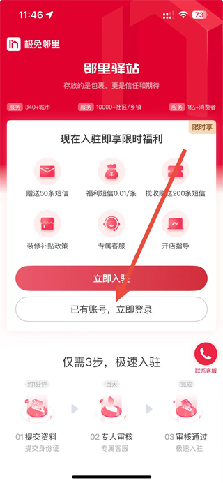 1、进入邻里掌柜应用后,找到已有账号,立即登录按钮并点击,进入登录相关操作页面。