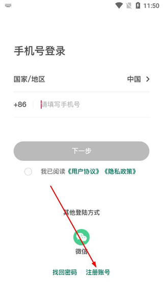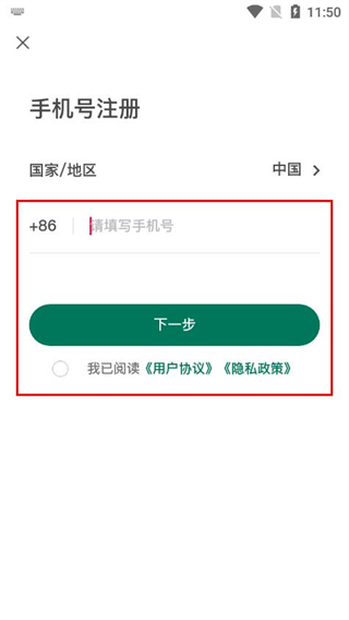 2、在注册界面填写手机号,勾选我已阅读用户协议,点击下一步。