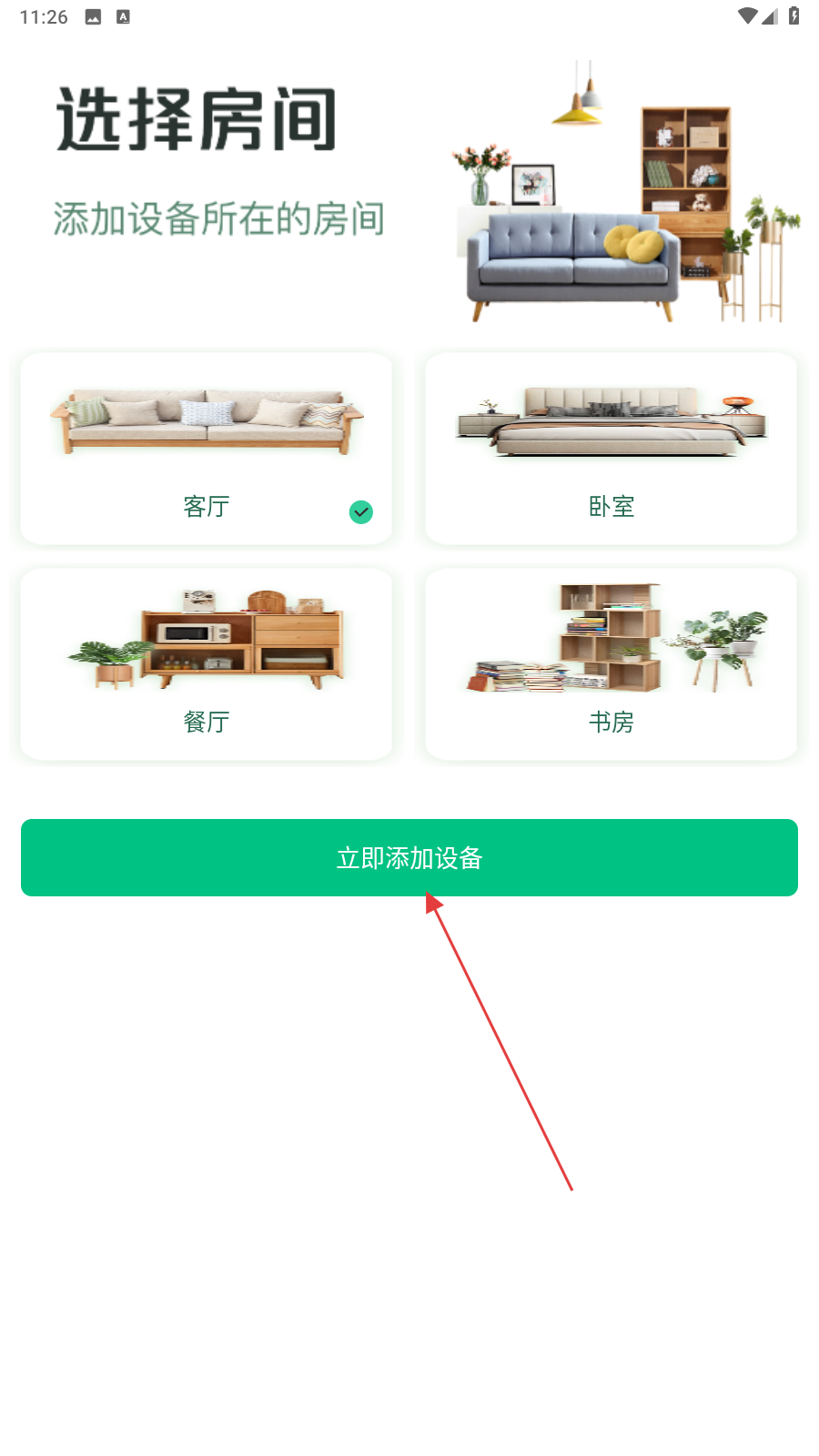 4、在选择房间的页面内,选择客厅并点击立即添加设备的按钮即可。