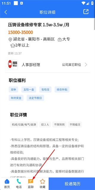 3、在职位详细页面确认信息后,点击直聊按钮进行在线直聊。