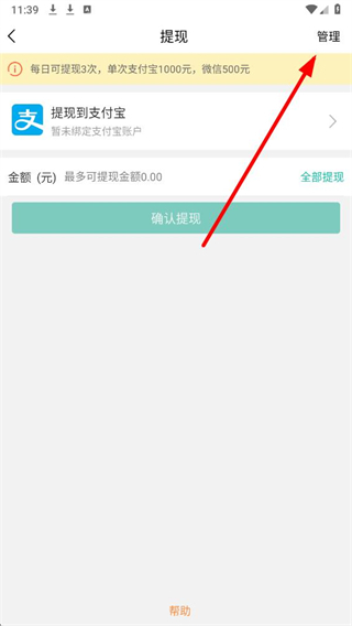 3、在提现页面,点击右上角的管理选项,进入管理提现账户页面。
