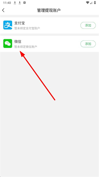 4、在该页面找到微信对应的添加按钮,完成微信账户绑定后,输入金额并点击确认提现即可。