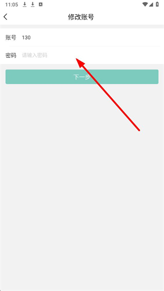 4、在修改账号页面,填写当前账号对应的密码,点击下一步按钮,按提示完成账号修改操作。