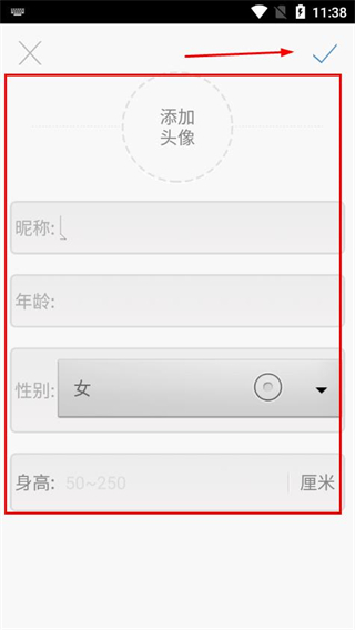 2、在信息界面填写昵称、年龄、选择性别、输入身高,点击确认,保存用户信息。