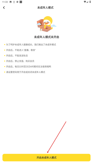 4、在未成年模式页面中,点击开启未成年模按钮,完成开启操作。