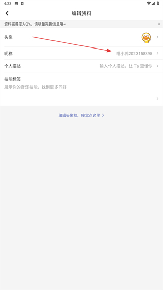 3、进入编辑资料的页面内,点击昵称的区域位置。
