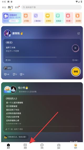 1、打开唱鸭APP进入到首页内,点击导航栏中直播的按钮。