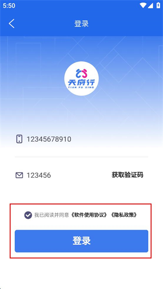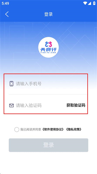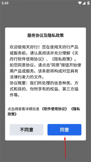 1、打开天府行软件,阅读服务协议及隐私政策相关内容,点击同意按钮,进入软件主界面。