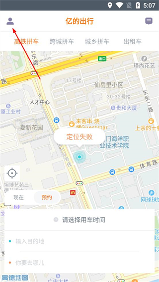 1、打开亿的出行,进入首页后,点击页面左上角的个人图标进入相关界面。