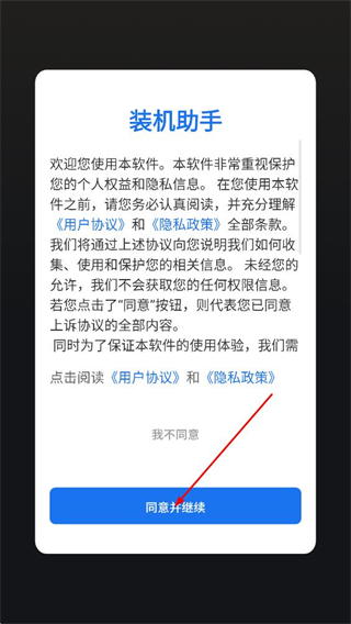 1、阅读用户协议和隐私政策后,点击弹窗中的同意并继续按钮。