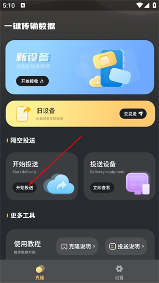 2、在一键传输数据页面,点击开始投送按钮,进入检测设备页面。