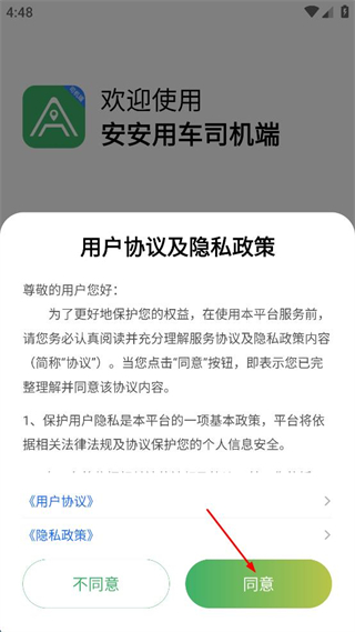 1、打开安安用车司机端,阅读用户协议及隐私政策内容,确认后点击同意按钮。