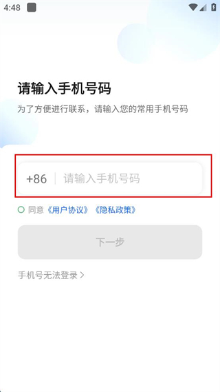 2、进入请输入手机号码页面,在对应输入框中填写常用的手机号码信息。
