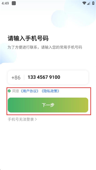 3、勾选同意用户协议和隐私政策的选项,点击页面中的下一步按钮。