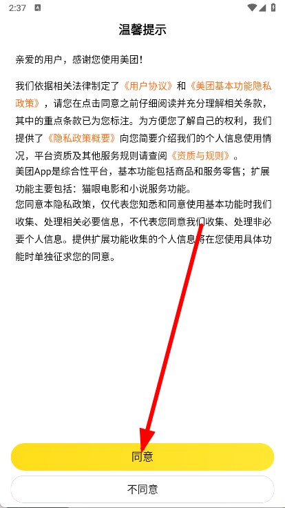 1、打开美团APP,在弹出的温馨提示中点击同意。