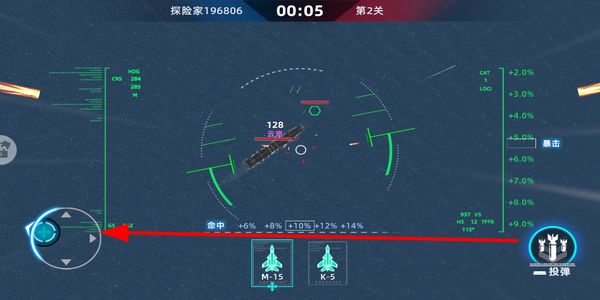 4、玩家在驾驶战斗机时,调整攻击角度,选择合适的时机点击投弹按钮发起攻击,精准命中敌方目标以占据优势。