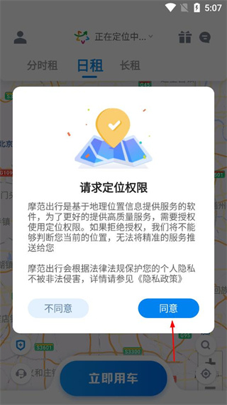 1、打开摩范出行应用,查看请求定位权限的提示,点击同意按钮进入主页面。