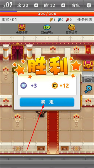 3、战斗胜利后,会弹出胜利提示窗口,点击确定,领取经验、金币等奖励,提升角色等级。