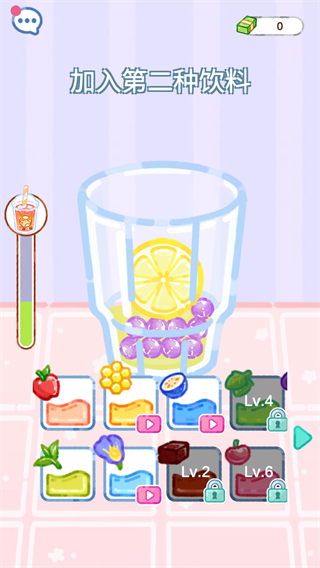 4、倒入饮品并添加柠檬等辅料,完成小吃制作,推进关卡进度。
